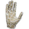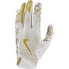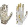 The Nike Vapor Jet 8.0 Football Gloves Metallic, available at Source for Sports, feature Magnigrip+ palms for superior grip in any weather. Breathable mesh panels keep hands cool, while stretchy back material and a snug wrist closure ensure a flexible fit. Strategic padding adds protection for intense plays.