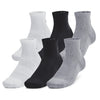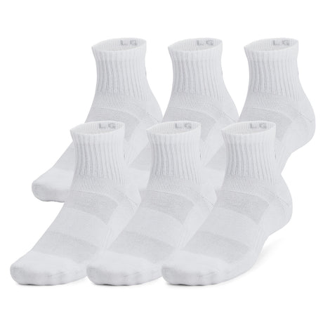 The Under Armour Tech Crew Quarter Socks provide breathable comfort with moisture-wicking fabric, cushioned support, and a snug fit ideal for active wear.